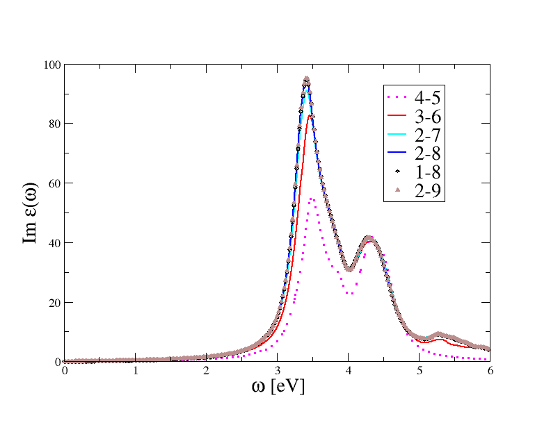 First of all one should select the frequency range of interest since this choice has an important effect on the number of valence and conduction states that have to be included in the transition space. The optical spectrum is expected to converge faster in the number of bands than the GW corrections since only those transitions whose energy is “close” to the frequency range under investigation are expected to contribute.