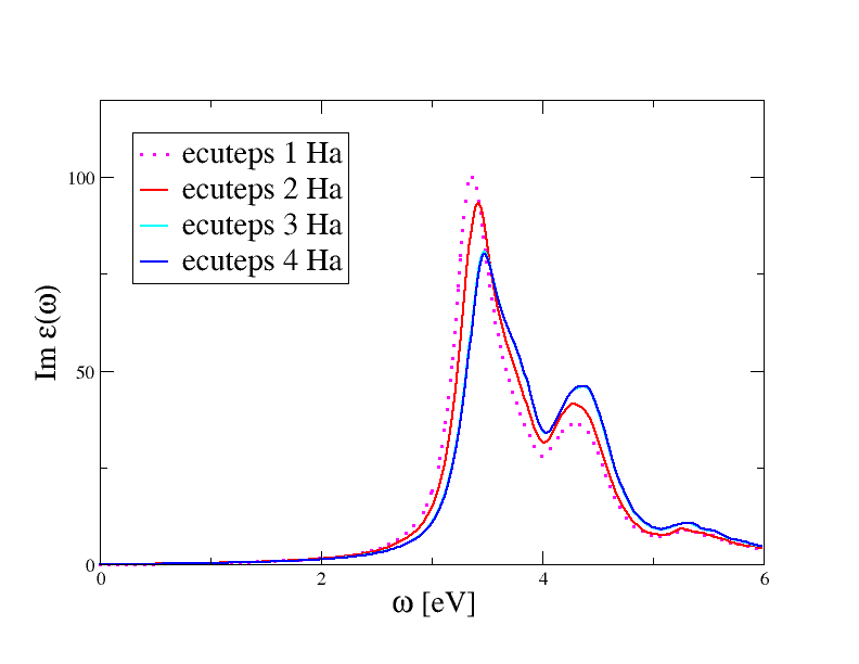The spectrum is found to converge quickly in ecuteps. The curves obtained with ecuteps = 3 and 4 Ha are almost indistinguishable from each other. Our final estimate for ecuteps is therefore 3 Ha.