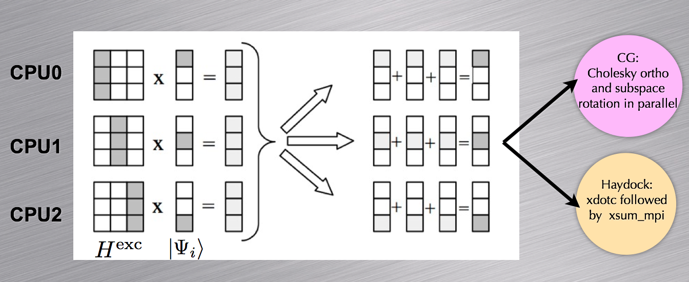 In the second step, each node reads the data stored in the external files in order to build the excitonic Hamiltonian. The matrix is distributed using a column-block partitioning, so that the matrix-vector multiplications required in the Haydock iterative scheme can be easily performed in parallel (see the schematic representation reported below). A similar distribution scheme is also employed for the conjugate-gradient minimization. For a balanced distribution of computational work, the number of processors should divide the total number of resonant transitions.