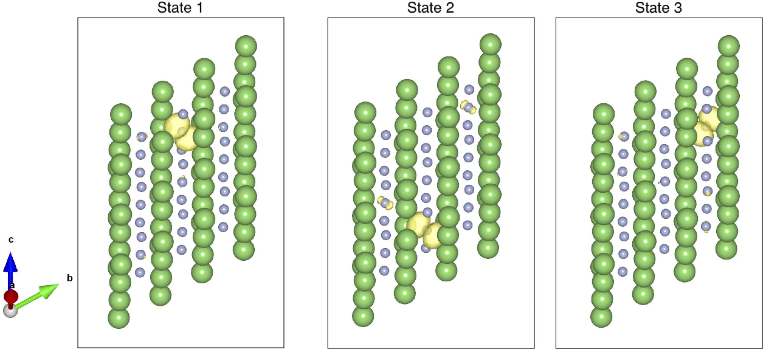Note that state 1 and 3 are instances of a triply-degenerate hole polaron, and oriented along two different directions of the <100> cubic family. That’s why they are close in binding energy (~ 0.1 % difference), and the difference may decrease if we ask for stricter convergence with vpq_tolgrs. These polarons have \(D_{4h}\) point group symmetry.