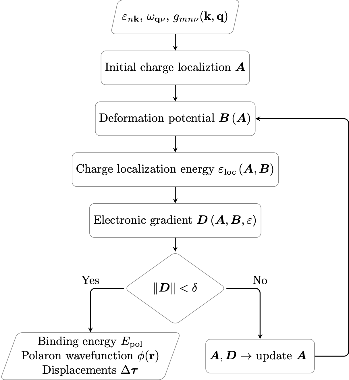 From this gradient, a new charge distribution \(\boldsymbol{A}\) can be determined. Eqs. (\ref{eq:phgrad}-\ref{eq:elgrad}) constitute the building blocks of any gradient-based algorithm for the binding energy optimization. In ABINIT, we employ the preconditioned conjugate gradient algorithm [Payne1992]. After the variational expression is minimized, the optimal \(\boldsymbol{A}\) and \(\boldsymbol{B}\) coefficients are determined and the polaron in real space can be reconstructed via Eqs. (\ref{eq:polaron_phi}),(\ref{eq:polaron_tau}). Schematically, the optimization process is described in the following chart: