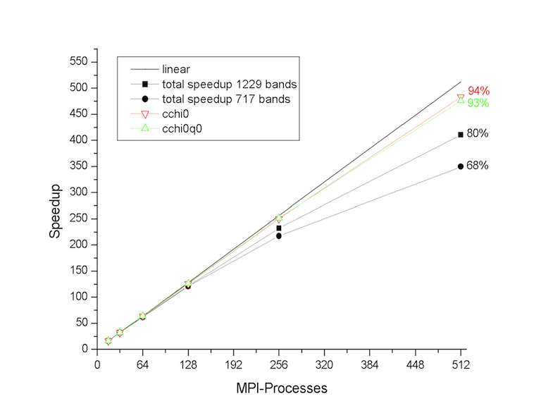 To summarize: The MPI computation of the correlation part is efficient when the number of processors divides nband. Optimal scaling in the exchange part is obtained only when each node possesses the full set of occupied states.