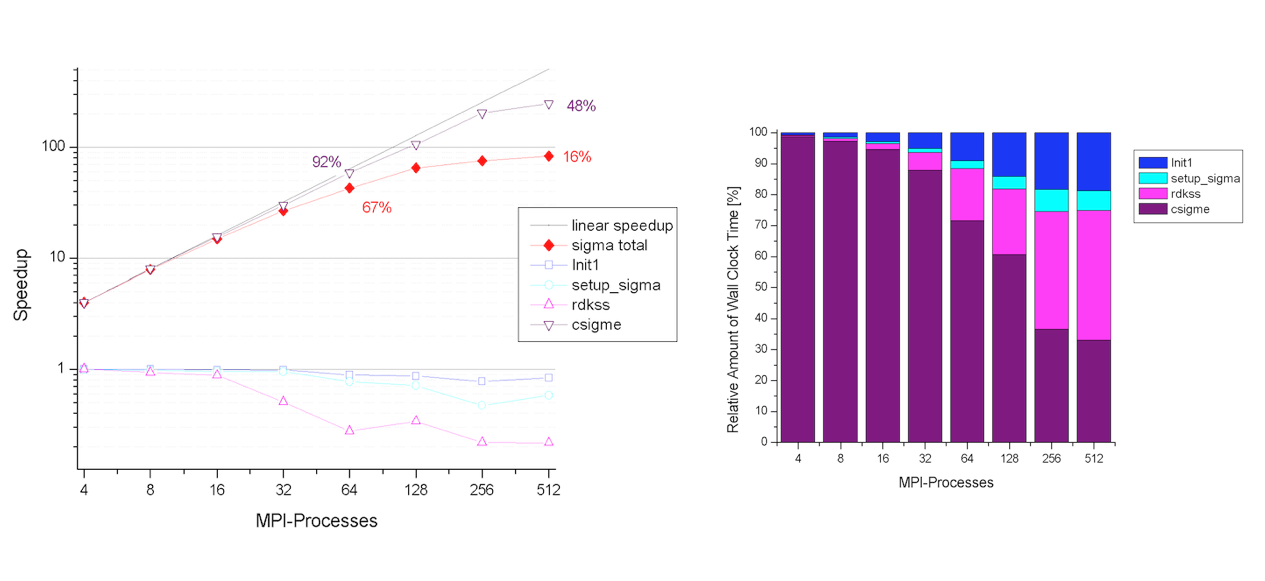 The two figures below show the speedup of the sigma part as function of the number of processors. The self-energy is calculated for 5 quasiparticle states using nband=1024 (205 occupied states). Note that this setup is close to the worst-case scenario. The computation of the self-energy matrix elements (csigme) scales well up to 64 processors. For large number number of CPUs, the scaling departs from the linear behavior due to the unbalanced distribution of the occupied bands. The non-scalable parts of the implementation (init1, rdkss) limit the total speedup due to Amdhal’s law.
