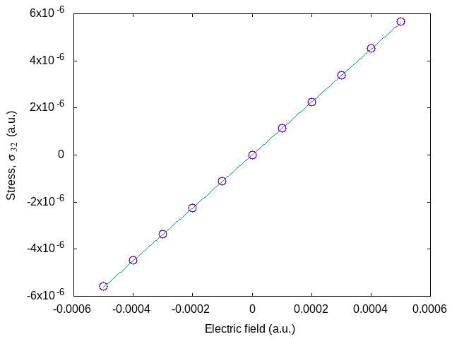 Looking at the evolution of the stress with electric field (see graphic below), you should also be able to extract the piezoelectric constants. You can try to do it as an exercise. As the calculation here was at clamped ions, you will get the clamped ion proper piezoelectric constants. You should obtain -0.6365 C/m\(^2\). The relationships between the various response functions under conditions of strain, stress, field, and so forth are discussed in depth in [Wu2005].